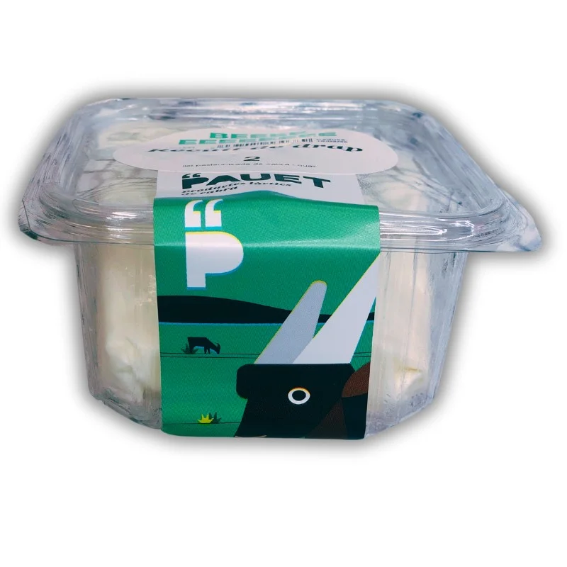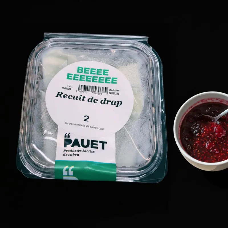 El Recuit de Drap de Cabra Pauet 2 és un formatge fresc tradicional elaborat artesanalment amb llet pasteuritzada de cabra i quall. Conegut per la seva textura suau i cremosa, aquest recuit es caracteritza per un gust delicat i lleugerament dolç, ideal per acompanyar amb mel, fruita fresca o fruits secs. Un producte natural i saludable, perfecte per gaudir d’un postre lleuger o per incorporar en receptes gastronòmiques.
