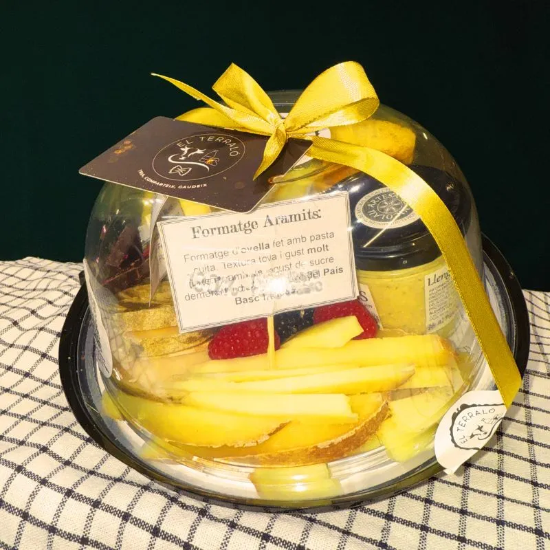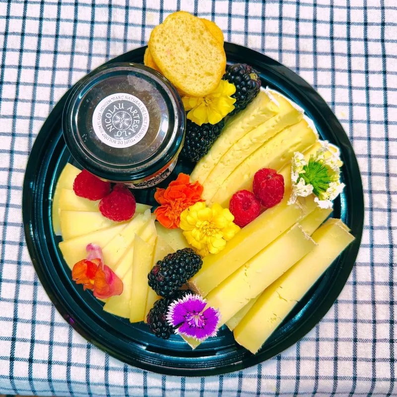 La Taula de Formatges Gourmet Essència és la manera més senzilla i exquisida de gaudir del món del formatge artesanal. Pensada per a 2–3 persones, combina tres tipus de formatges gourmet (vaca, cabra i ovella) amb fruita fresca de temporada, un toc dolç de codonyat o melmelada sense sucre, torradetes italianes amb gust de mantega i flors comestibles.
